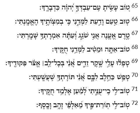 It’s not easy to grasp the psalm’s flow, because what’s obvious in Hebrew isn’t obvious in English—the 176 verses are divided into 22 blocks of 8 verses, each block containing a collection of verses beginning with the same letter of the Hebrew alphabet. For example, notice below that in the section 119.65-72, each line begins with the 9th letter of the Hebrew alphabet, the letter tet. It’s the character to the left of the verse numbers, as Hebrew is read from right to left.